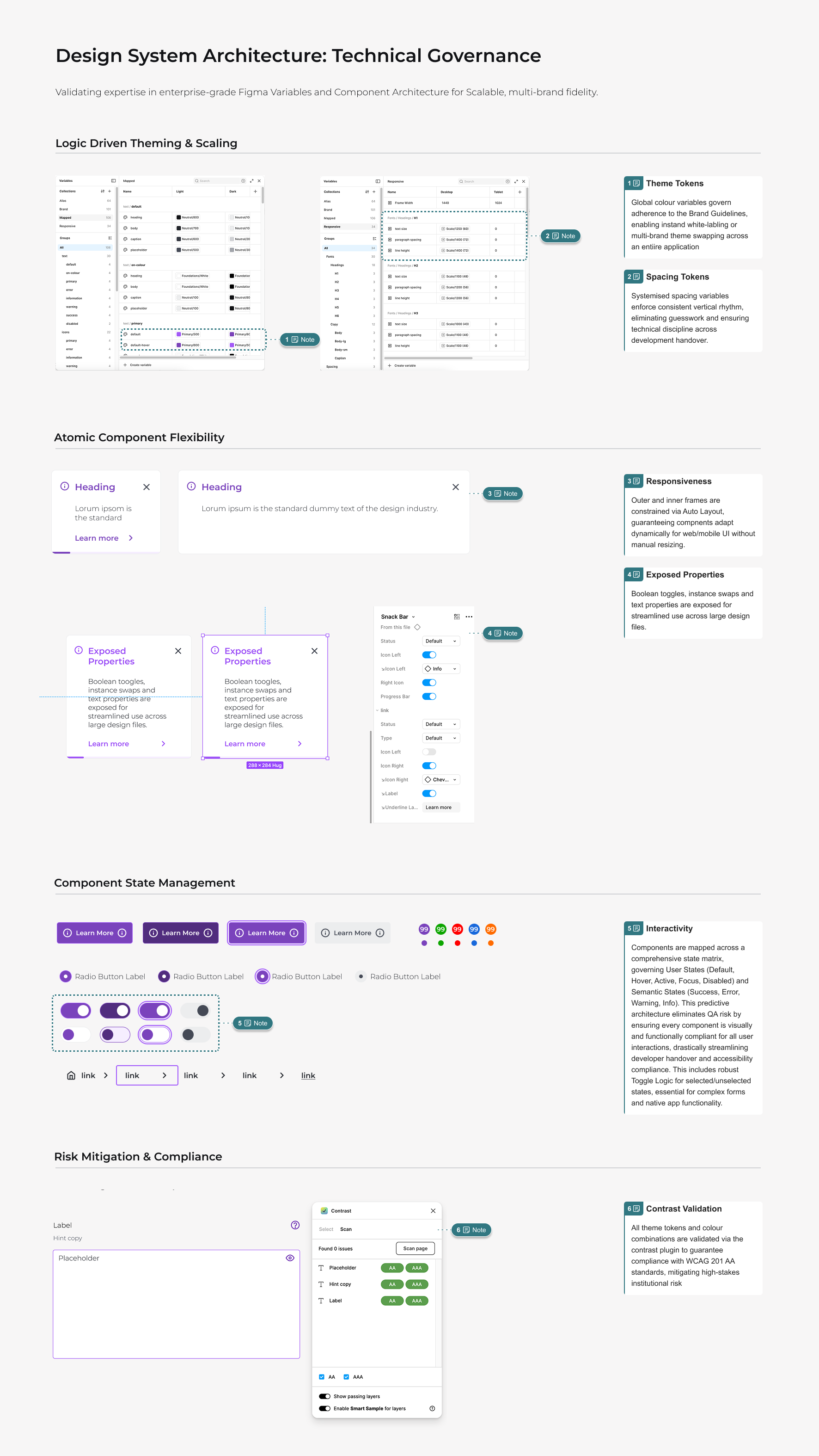 The primary focus is proving system integrity through advanced Figma features—specifically Variables, Auto Layout, and Component Properties—to streamline workflow, mitigate quality assurance (QA) risk, and uphold strict accessibility standards (WCAG 2.1 AA).